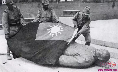 日本兵用青天白日旗覆盖孙中山铜像。